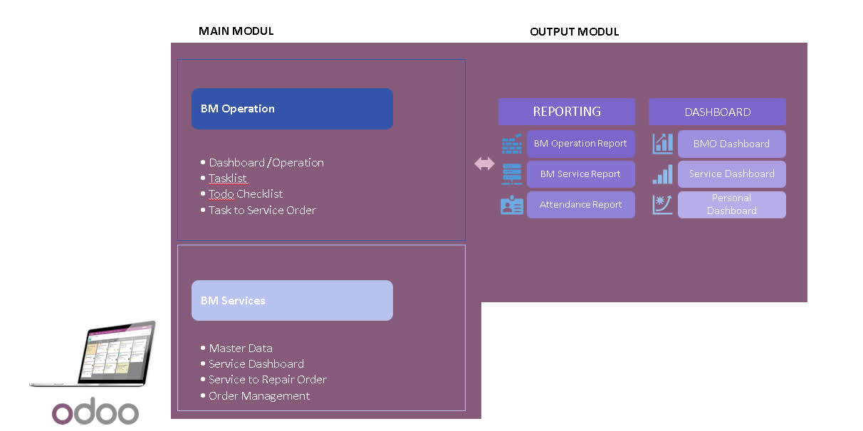 In order to increase the efficiency of MBUT business processes and increase the accuracy of MBUT management decision making, based on valid and complete data. MBUT decided to carry out further development of the Odoo ERP application which is currently operating at MBUT, especially in the areas of Business Support, CSO and Accounting. Further discussions regarding MBUT's enhancement needs resulted in the decision that MBUT would implement a Building Management & Maintenance Service System to support the integration of business processes related to building maintenance services and facilities.
